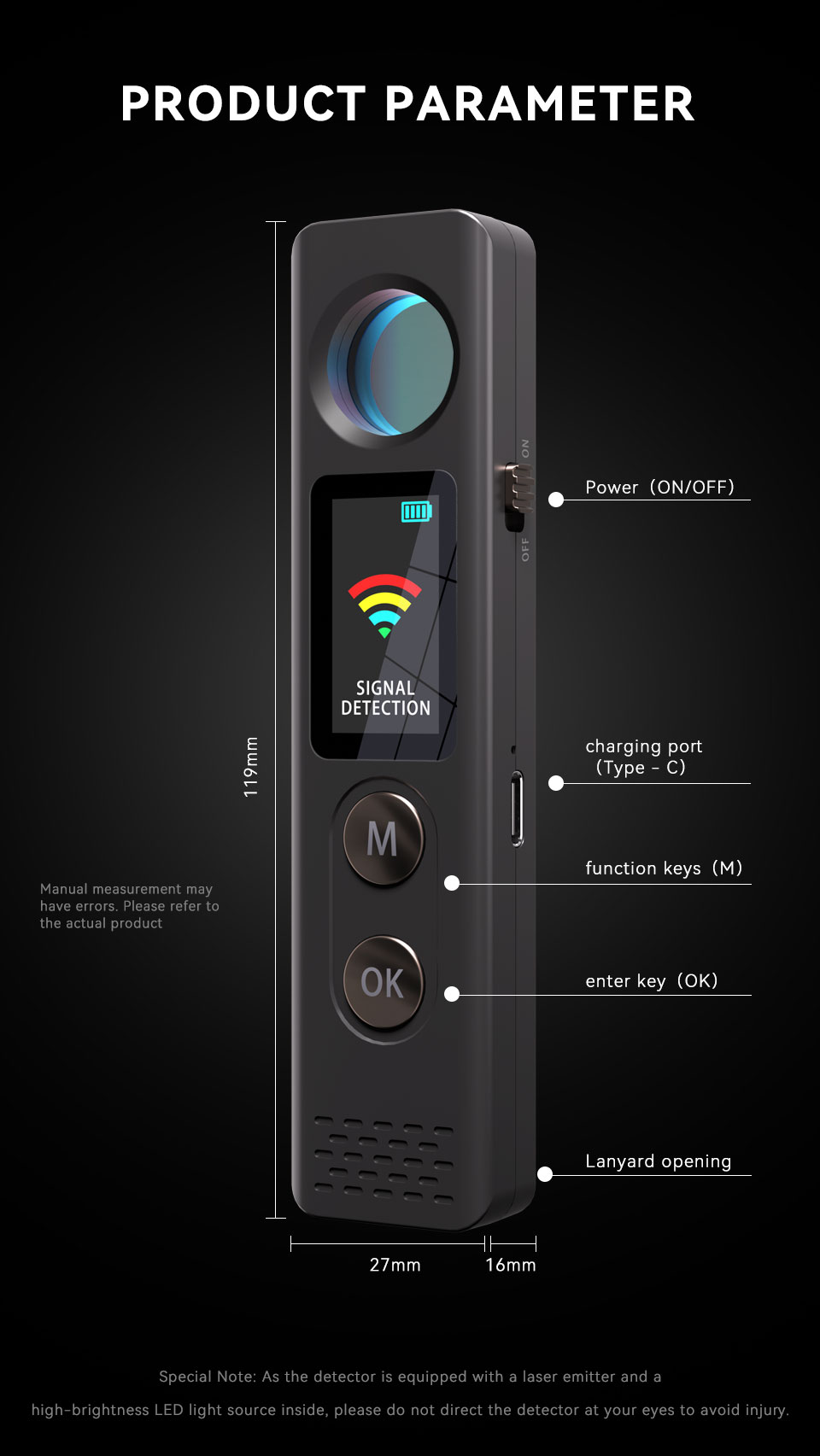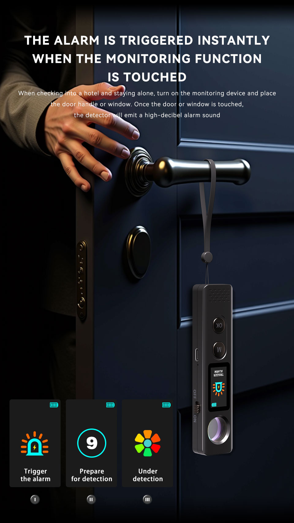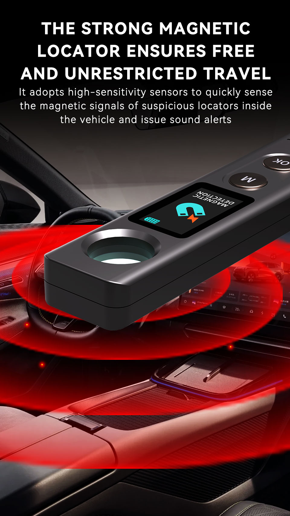 Strong Magnetic Field Detection: Utilizes high-sensitivity sensors to quickly detect magnetic signals from suspicious tracking devices inside vehicles and trigger an audible alarm.