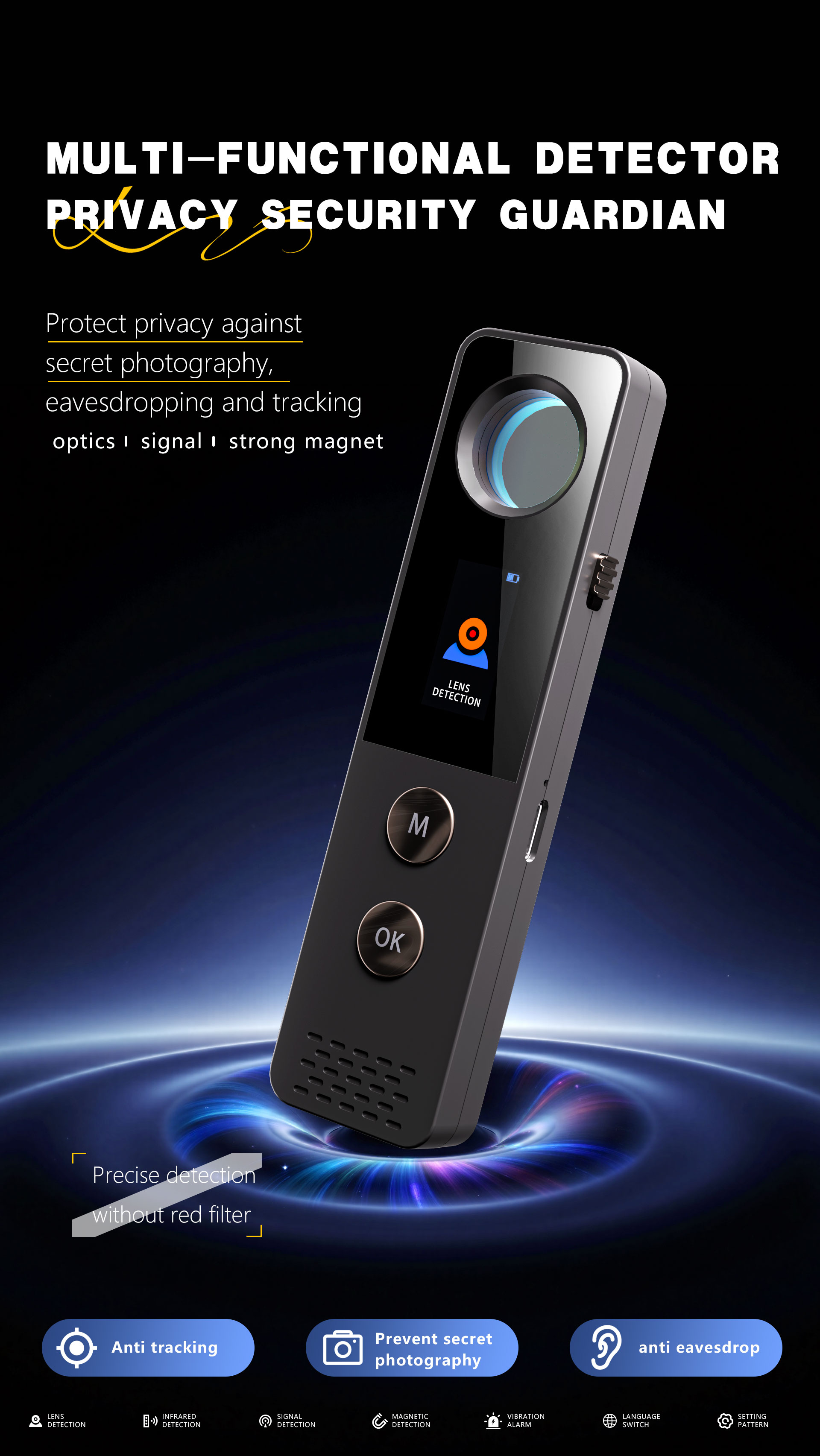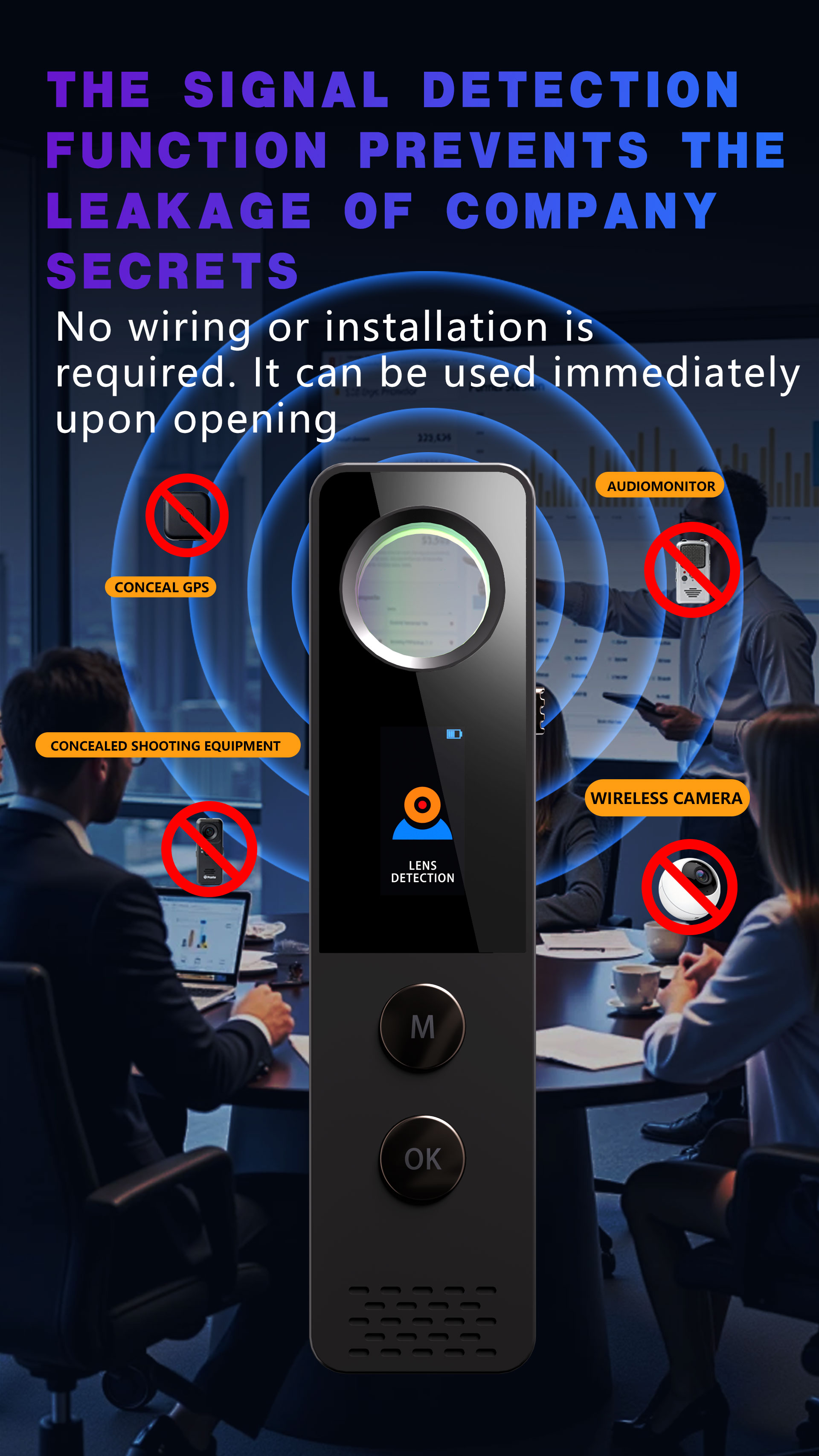 Signal Detection FunctionDetectable devices: Concealed GPS trackers, pinhole peeping cameras, audio bugs, wireless cameras
