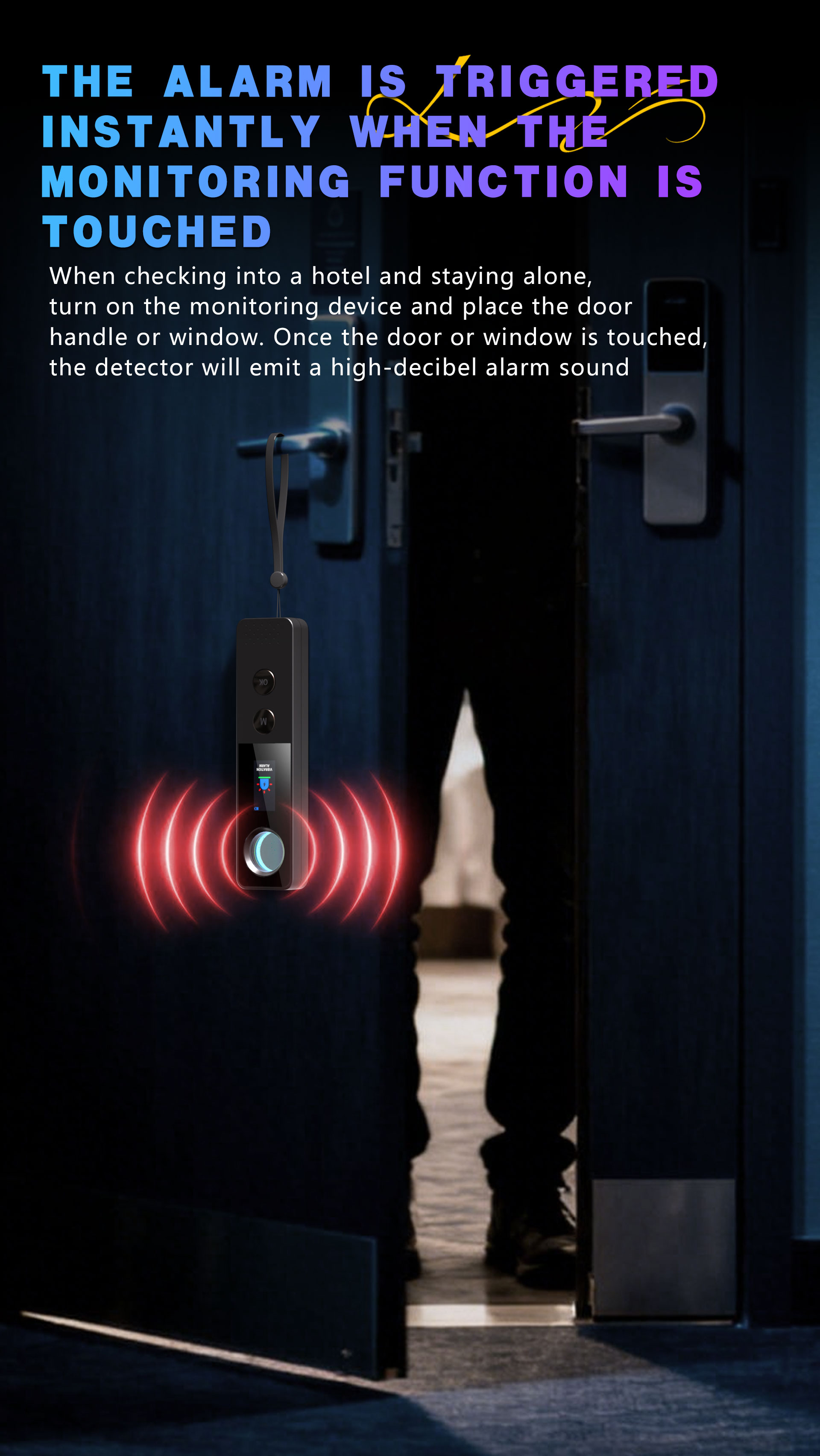 Vibration Alarm FunctionWhen checking into a hotel or living alone, activate the monitoring mode and hang the detector on the doorknob or window. The detector will emit a high-decibel alarm immediately once the door or window is touched.