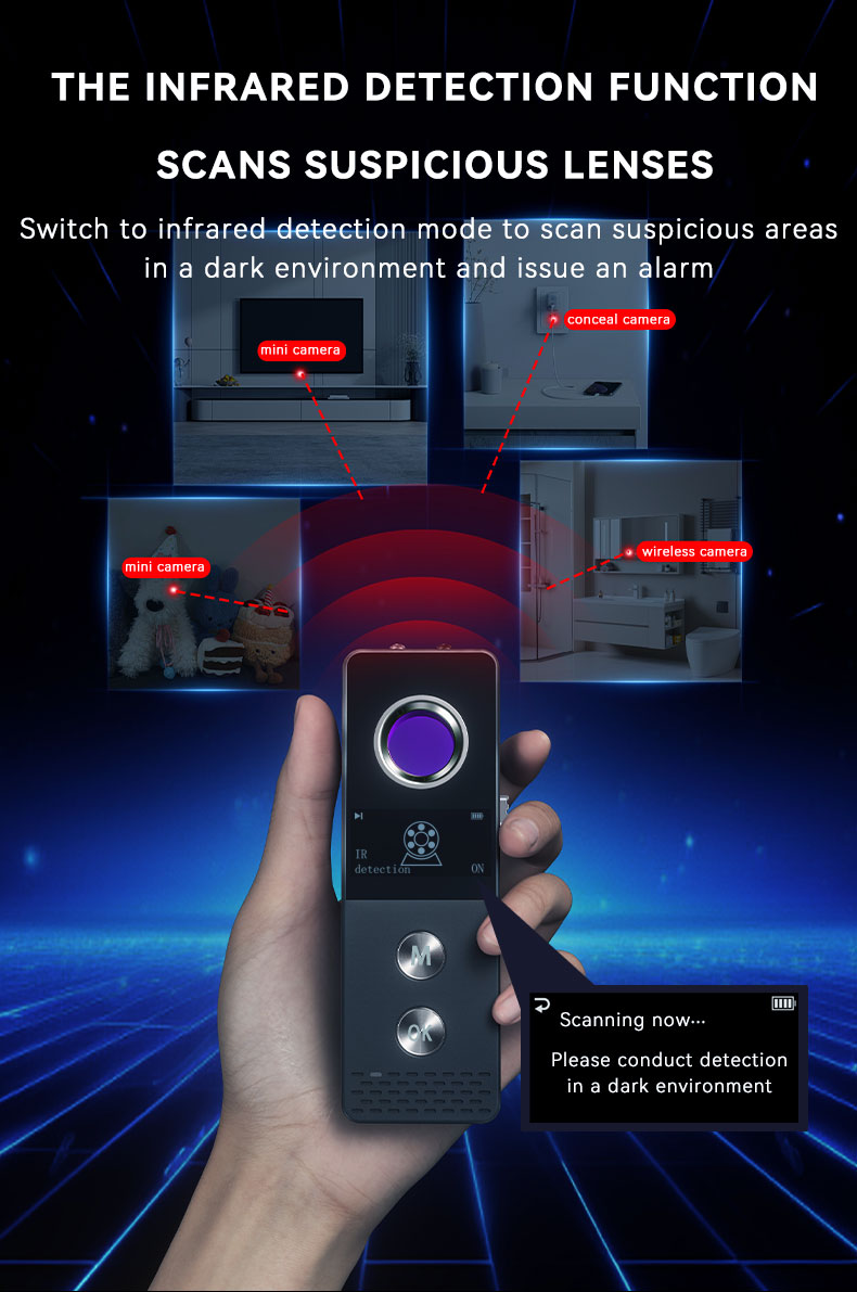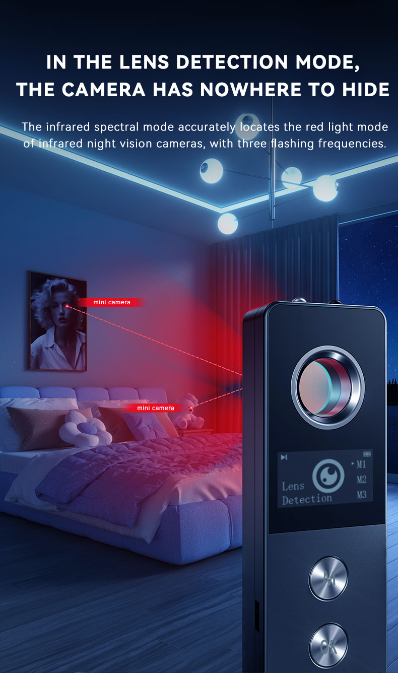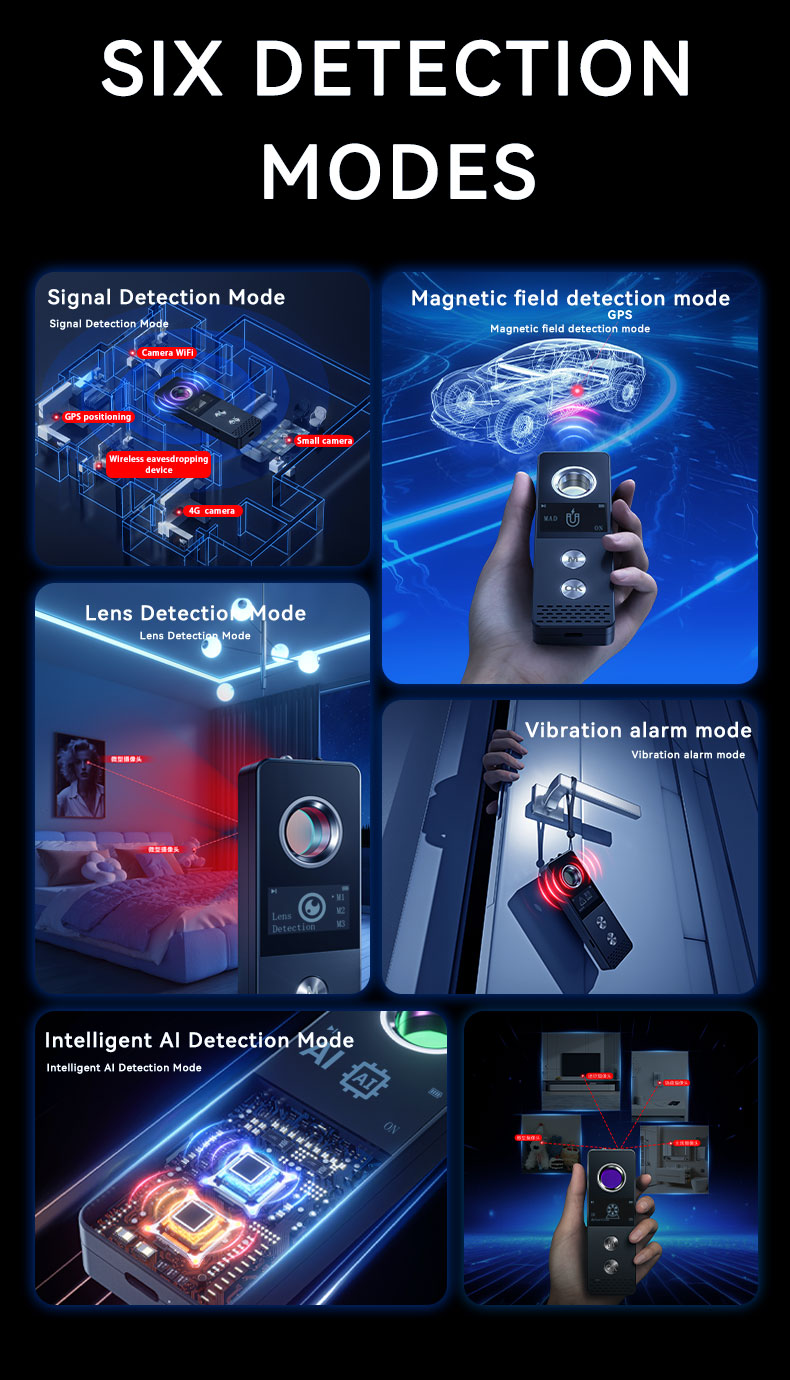 Six detection modes: Signal Detection Mode, Magnetic Field Detection Mode (GPS Positioning), Lens Detection Mode, Vibration Alarm Mode, Intelligent AI Detection Mode